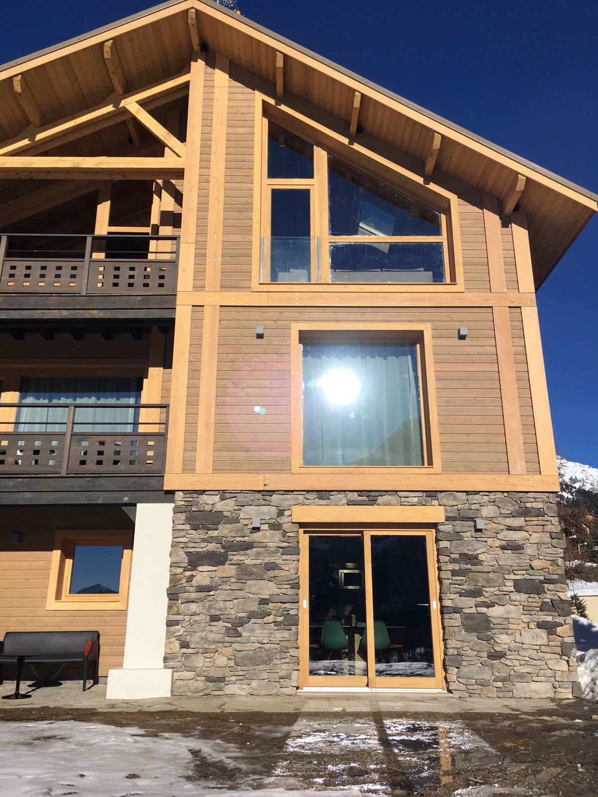 - menuiseries extérieures: Bois, profilés lamellé-collé en Mélèze de Sibérie;